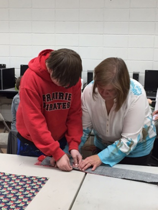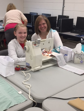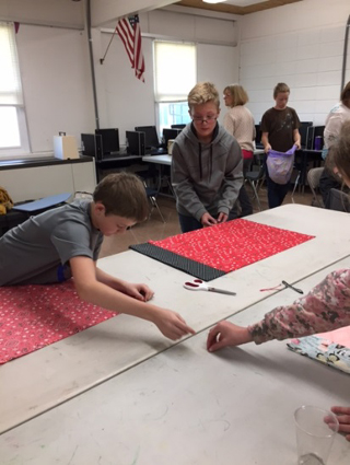 Sixth graders and their adult helpers with the pillowcases they made for the Shriners Hospital. Below are some photos from when they were making them. Photos provided by Colleen Sonnen.