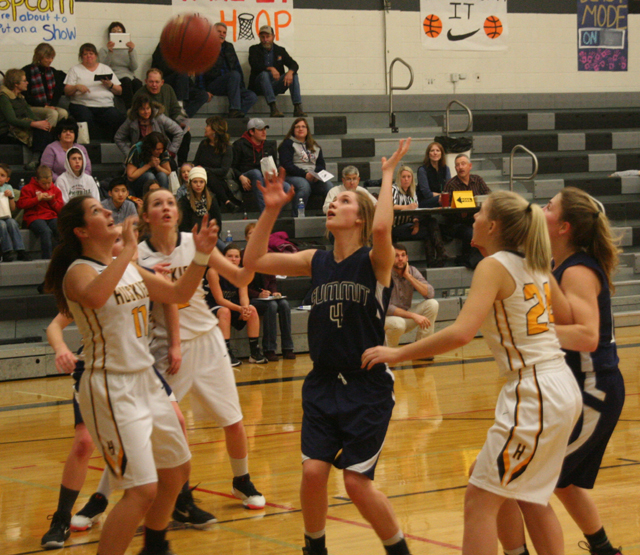 Everybody waits for the ball to come down. Lauren Stubbers and Highland’s #11 seem to have the best shot at the rebound. At right is Taylor Lustig. Photo by Steve Wherry.