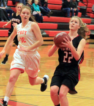 Prairie led 40-9 by halftime. Troy was limited to just 2 baskets in the opening half with their other 5 points coming at the line out of 14 attempts. Prairie scored the first 9 points of the third quart with Jordyn Higgins picking up her third 3-pointer of the game, for a 49-9 lead. The pace slowed the rest of the third quarter as Prairie led 51-13 heading into the fourth quarter. Troy scored first in the final period then Prairie scored 8 straight points before Troy got the final 2 at the free throw line. Jordyn Higgins led a balanced scoring attack with 13 points as Josie Peery and Sydney Bruner added 12 points each. Leah Higgins and India Peery scored 7 each with Theresa Wemhoff scoring 5. Sarah Ross added 2 and Alexis Hiler 1. Prairie had a slim 26-23 rebounding edge with Josie Peery leading the Pirates with 5 while Leah Higgins had 4. Leah Higgins had 4 steals and 4 assists while India Peery had 7 assists and Jordyn Higgins had 5. Prairie was 22 for 45 from the field, 49%, and 9 for 14 at the line, 64%. Troy was 5 for 20 from the field, 25%, and 7 for 16 at the line, 44%. Prairie is now 16-1 on the season and 11-0 in league play. The JV team stayed unbeaten on the season with a 35-10 win in a 2-quarter game. Troy’s JV team did not make a single basket in the game as all their points came at the free throw line. Prairie jumped out to a 9-0 lead in the game and after a Troy free throw, Prairie scored the next 13 straight points. Chaffee had 4 points in the opening quarter while Kendra Duclos and Uhlenkott scored 3 each. Prairie led 16-1 at the end of the opening quarter. They made it 22-1 in the second quarter before they got to their 7th foul and started sending Troy to the line. Troy wound up attempting 13 free throws in the second quarter, making 9. Prairie meanwhile got 6 points each from Tidwell and Chaffee as they made sure Troy didn’t make any headway even with all the free throw opportunities. Chaffee wound up with 10 points to lead the scoring with Tidwell adding 8. Uhlenkott scored 5 while Riener and Hope McIntire scored 4 each. Bruegeman scored 3 and Schwartz scored 2. Prairie had a 13-11 rebounding edge led by Chaffee with 4. McIntire had 4 steals and 6 assists while Chaffee had 3 steals. The JV’s were 15 for 29 from the field, 52%, and 6 for 8 at the line, 75%. Troy was 0 for 6 from the field and 10 for 15 at the line, 67%. Prairie 20 20 11 8 -59 Troy 3 6 4 4 -17 Prairie-J. Peery 5-6, 2-3, 12; J. Higgins 5-7, 0-0, 13; L. Higgins 1-5, 4-4, 7; Bruner 5-6, 2-4, 12; I. Peery 3-8, 0-1, 7; Hiler 0-1, 1-2, 1; Wemhoff 2-7, 0-0, 5; Krogh 0-2, 0-0, 0; Ross 1-2, 0-0, 2; Tidwell 0-0, 0-0, 0; Chaffee 0-0, 0-0, 0; Duclos 0-1, 0-0, 0. 3-pointers-J. Higgins 3, L. Higgins, I. Peery, Wemhoff. Troy-Doumit 2-7, 2-5, 6; Fry 3-5, 0-1, 6; Johnson 0-2, 3-6, 3; Gilder 0-1, 1-2, 1; Fredrickson 0-3, 0-0, 0; Cook 0-0, 0-0, 0; Hunter 0-1, 0-0, 0; Webler 0-0, 1-2, 1; Grove 0-0, 0-0, 0; Jensen 0-0, 0-0, 0; Blum 0-0, 0-0, 0. 3-pointers-none.