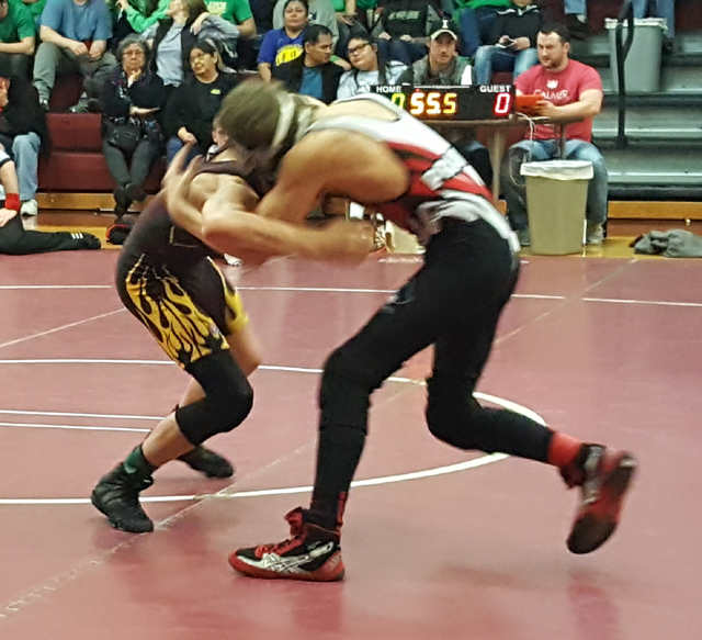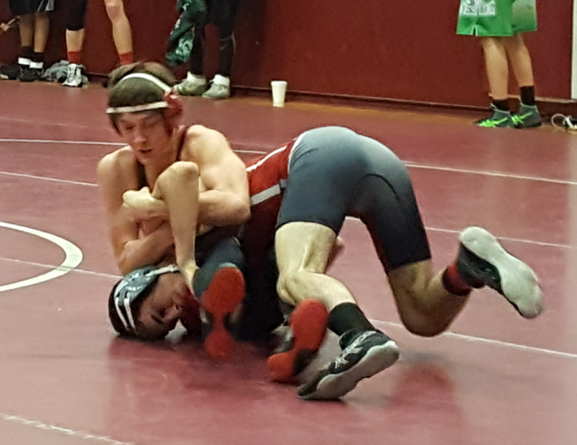 Lane Remacle at the District meet against Brody McCord of Kamiah. Photo by Tina Perrin.