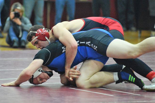 Jace Perrin against Jasavan Westling of Orofino at the District Wrestling meet. Photo by Andrew Ottoson of the Idaho County Free Press.