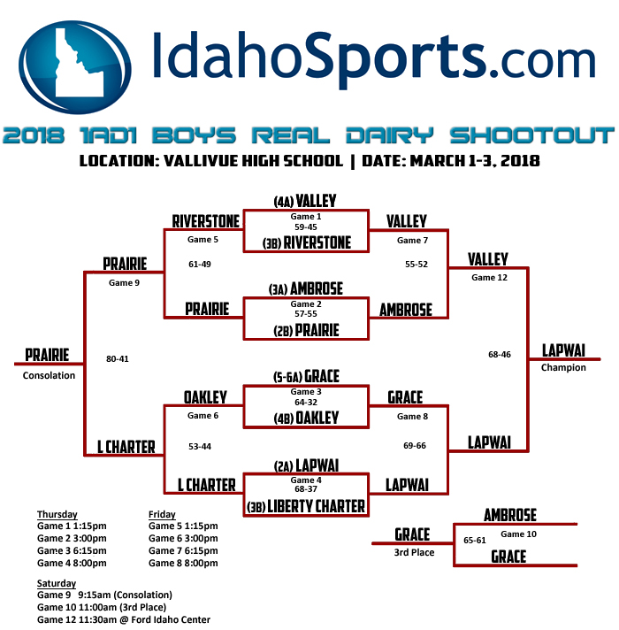 The final bracket at the boys 1A-D1 State Tournament. PIRATES BOYS BASKETBALL SCHEDULE FOR 2017-18 *indicates league game 9-Troy Quad, here*, 4 & 5:30, won43-31 14-Lapwai, here*, lost 33-67 15-Grangeville, here, Idaho County Shootout, V only, 7:30 p.m., won 51-46 19-Asotin, Quad, there, 4:30, won 67-59 6-Genesee, there*, won 49-44 8-C.V., here*, won 72-24 12-Potlatch, here*, won 45-37 18-Kamiah, there*, lost 29-31 20-Troy Quad, there*, 4 & 5:30, won 63-44 23-Lapwai, there*, won 51-35 26-Orofino, there, won 49-23 29-Asotin, Quad, here, 4:30, rescheduled from Jan. 2, won 50-37 3-Genesee, here*, won 37-29 5-Moscow, there, won 55-52 8-C.V., there*, won 63-39 10-Orofino, here, won 68-16 13-District at LCSC vs. Potlatch, won 42-38 20-District Championship game vs. Lapwai, 7:30 p.m., lost 29-58 22-District 2nd Place game vs. Potlatch, 7:30 p.m., won 58-44 24-State Play-In at Post Falls vs. Wallace, 1:00 p.m., won 65-48 March 1-3-State at Caldwell, Open vs. Ambrose, 2 p.m. PST, Thursday, March 1, lost to Ambrose, 55-57, beat Riverstone 61-49, beat Liberty Charter 80-41. 2018 BASEBALL March 17-Pomeroy, here, (2), 11 a.m. 22-Lapwai, there, 4:30 p.m. 23-Kendrick, there (2), 3 p.m. 27-Grangeville, here, 4:30 p.m. 13-Grangeville, there, 4:30 p.m. 14-Troy, there, (2), 11 a.m. 16-Highland, there, 4:30 p.m. 17-Genesee, there 4:30 p.m. 19-Lapwai, here, 4:30 p.m. 24-Genesee, here 4:30 p.m. 28-Potlatch, there, 4:30 p.m. 4-St. Maries @ Lewiston, 4 p.m. 8-District play-ins @ higher seed 10-12-District at Orofino 18-19-State at Orofino |