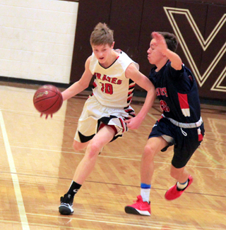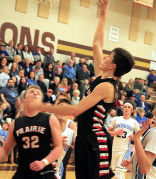 Coach Kevin Chaffee changed things up a bit by having Dylan Schumacher start ahead of Damian Forsmann. Ross got things started with a pair of free throws and added a basket on an inbounds play. Spencer Schumacher converted a 3-point play. Mager scored inside. Chaffee sank a 3 and then added a free throw for the 13-0 lead. Spencer Schumacher wound up scoring 13 first quarter points as Prairie continued to go inside while Mager, Ross and Chaffee each had 6 and Anderson scored 2. Riverstone meanwhile was limited mostly to outside shooting as 4 of their 5 first quarter baskets were 3-pointers. Prairie took the full-court press off in the second quarter and still managed to outscore the Otters 12-8 with Spencer Schumacher adding 4 more for 17 first half points. Mager and Chaffee each scored 3 in the quarter and Ross added 2 as Prairie took a 45-22 lead in to the halftime break. In the third quarter Riverstone came out with a 2-10 run to pull within 15 at 47-32. Prairie then responded with 7 straight points to push the lead back to 22 at 54-32. Prairie led 57-37 after 3 quarters. Prairie scored just 4 points in the fourth quarter but hung on to win as Riverstone finished the game on a 1-12 run to get back within 12 at the finish. Spencer Schumacher wound up with 23 points to lead the scoring. Ross scored 12 with Mager and Chaffee adding 11 each. Anderson scored 4. Prairie had a 44-33 advantage on the boards led by Ross with 13 rebounds and Spencer Schumacher with 11. Spencer Schumacher had 5 steals and Chaffee and Dylan Schumacher each had 4 assists. Prairie was 24 for 57 from the field, 52%, and 10 for 24 at the line, 42%. Riverstone was 18 for 52 from the field, 35%, and 4 for 10 at the line, 40%. Prairie 33 12 12 4 -61 Riverstone 14 8 15 12 -49 Prairie-Mager 4-8, 2-2, 11; Chaffee 4-15, 2-4, 11; D. Schumacher 0-0, 0-0, 0; Ross 4-12, 4-9, 12; S. Schumacher 10-18, 2-9, 23; Anderson 2-4, 0-0, 4; Shears 0-0, 0-0, 0. 3-pointers-Mager, Chaffee, S. Schumacher. Riverstone-Moyett 2-7, 2-4, 7; Hanson-Kaplan 1-1, 0-0, 3; Deboer 1-5, 0-0, 3; Liebich 2-7, 1-4, 5; Linder 5-8, 0-0, 10; Coyle 4-10, 0-0, 11; Benner 2-6, 0-0, 6; Hurt 1-2, 1-2, 3; Mark 0-2, 0-0, 0; Corddry 0-4, 0-0, 0. 3-pointers-Coyle 3, Benner 2, Moyett, Hanson-Kaplan, Deboer.