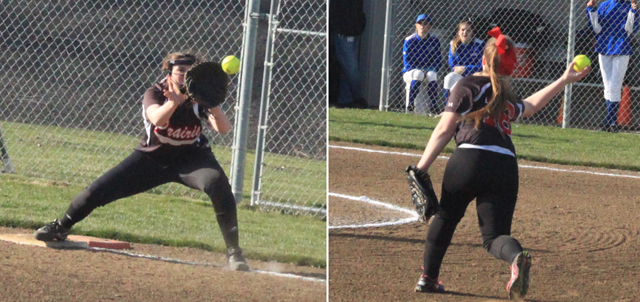 Both ends of a groundout. At right, Noelle Uhlenkott throws to first after fielding a grounder. At left, Sydney Bruner stretches to catch Uhlenkott’s throw.