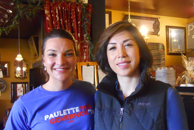 Democratic Gubernatorial candidate Paulette Jordan, right, was in Grangeville last Tuesday. She is shown with her policy and research writer Nichole Solberg, a 2011 Grangeville graduate. Photo by Michelle Perdue. |