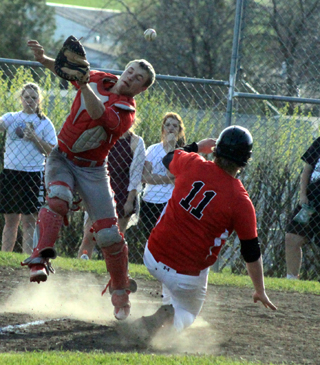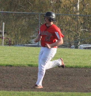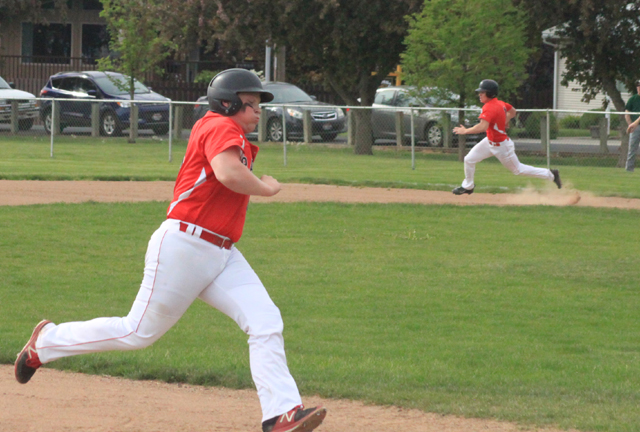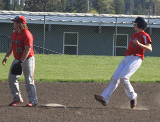 Dereck Arnzen is about to round third and score against St. Maries on Owen Anderson’s double. Anderson can be seen heading for second.