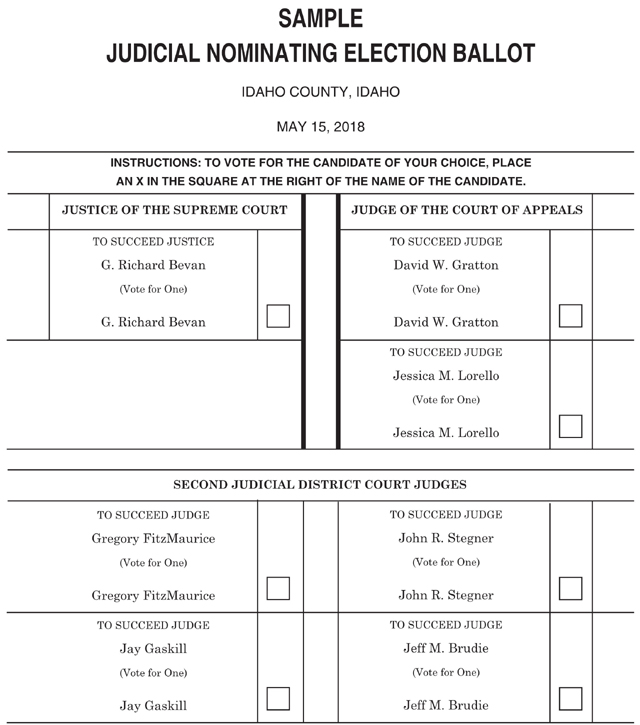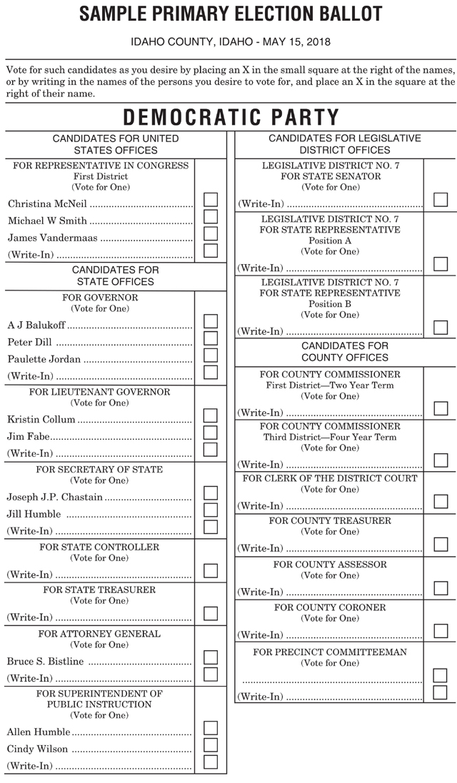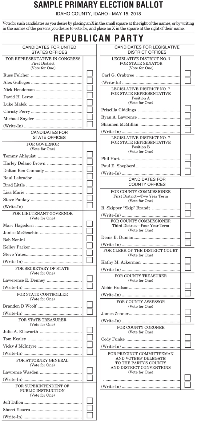 The statewide primary election is set for next Tuesday, May 15 with contested races on both the Republican and Democratic ballots. For Idaho County offices there are no Democratic candidates and all the Republican incumbents are unopposed. For the District 7 legislative seats Carl Crabtree is unopposed for state senate on the Republican ballot. Incumbent state representative, Position A, Priscilla Giddings is facing a challenge from Shannon McMillan, who she defeated for the post 2 years ago and Ryan A. Lawrence. Incumbent state representative, Position B, Paul Shepherd is facing a challenge from Phil Hart, a former District 3 representative who moved into District 7. In both representative races, the challengers are mostly seeking to give representation to the northern portion of the sprawling District 7 which reaches from south of Riggins all the way to the Wallace area. Hart’s name was on the ballot, then taken off on a ruling by Secretary of State Lawerence Denney, then put back on as of Monday, May 7 due to a court challenge. There are no candidates for any of the legislative positions on the Democratic ballot. U.S Representative and Governor are the races that drew the most candidates. Incumbent Congressman Raul Labrador is resigning his seat to run for Governor. In the campaign to replace him are 7 Republicans and 3 Democrats. Republican candidates are Russ Fulcher, a former state legislator who ran for Governor 4 years ago, Alex Gallegos, Nick Henderson, former lieutenant governor David Leroy, Luke Malek, Christy Perry and Michael Snyder. Democrats running are Christina McNeil, Michael W. Smith and James Vandermaas. Governor also has 7 Republican candidates and 3 Democrats vying to replace retiring Governor Butch Otter. Republicans running are Labrador, Lieutenant Governor Brad Little, Tommy Ahlquist, Harley Brown, Dalton Cannady, Lisa Marie and Steve Pankey. Democrats running are A.J. Balukoff, who also ran 4 years ago, Peter Dill and Paulette Jordan. Lieutenant Governor has 5 Republicans and 2 Democrats looking to replace Little, who is running for Governor. Republican candidates are Marv Hagedorn, Janice McGeachin, Bob Nonini, Kelley Packer and Steve Yates. Democrats are Kristin Collum and Jim Fabe. Incumbent Denney is running unopposed on the Republican ballot for Secretary of State with Democrats Joseph J.P. Chastain and Jill Humble vying to face Denney in November. Incumbent Brandon D. Woolf is running unopposed for State Controller on the Republican ballot with no Democrats on the ballot. 3 Republicans are vying for State Treasurer. They are Julie A. Ellsworth, Tom Kenly and Vicky J. McIntyre. They are vying to replace incumbent Ron Crane. There are no Democrats on the ballot. Incumbent Attorney General Lawrence Wasden is running unopposed in the Republican Primary with Democrat Bruce S. Bistline looking to oppose him in November. For Superintendent of Public Instruction, incumbent Sherri Ybarra is facing a challenge from Jeff Dillon on the Republican ballot. Democrats Allen Humble and Cindy Wilson are vying to be their party’s nominee. There are also several judicial races with none of them featuring a contested race. Supreme Court Justice G. Richard Bevan is running unopposed. David W. Gratton and Jessica M. Lorello are both running unopposed for the positions as Judges of the Court of Appeals. Second Judicial District Court Judges Gregory FitzMaurice, Jay Gaskill, John R. Stegner and Jeff M. Brudie are all seeking re-election and are unopposed. Below are the sample ballots: