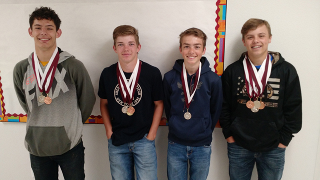 Junior High Track Medalists from the Saturday meet in Kamiah. 10 medals were earned. Jesse Cronan, TJ Hibbard, Zach Rambo and Brody Hasselstrom. Very proud of our Medalists and our whole teams efforts this year. Photo submitted by Glenn Poxleitner.. 2018 TRACK May 18-19-State at Middleton |