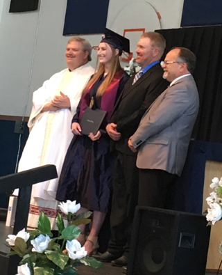 Fr. Paul was the commencement speaker for the Class of 2018. His talk focused on the value of being a good person over being a successful person. This was the 1st time in Summit history to have a Baccalaureate Mass for the Senior Graduation. In the past the graduates attended a Mass off campus and then returned to school for a separate graduation ceremony. This year Summit, being a Catholic School recognized by the Diocese of Boise, was permitted to do a Baccalaureate Mass in which the diplomas and awards are incorporated with a celebration of the Eucharist in Mass. After the Mass concluded a dessert reception was held in the gym and the Junior Class presented the slideshow. Following are the awards received by each graduating senior. Lucia Osborne Valedictorian, High Honors: Volleyball 4 years, Academic Bowl 4 years, Drama 4 years, 80 hours of Apostolic Service Certificate Scholarships: Knights of Columbus, $400 Presidential Scholarship, $2,500 High School Leadership, $500 She also received The Patriot Award, which goes to the Senior we can always rely on to work hard in all academic areas. This Senior has improved throughout the years due to his/her effort and determination. This person can be found very graciously volunteering to help out in many ways. His/her strong work ethic is a great example for all students. Lauren Stubbers, Salutatorian, Honors: Basketball 2 years, Volleyball 3 years, Academic Bowl 4 years, Drama 4 years, Student Government 4 years, 80 hours of Apostolic Service Certificate Scholarships: Idaho Opportunities Scholarship, $3,500 University of Idaho Silver Scholarship, $2,000 She also received The Excelsior Award, which goes to the overall Senior student who has grown in all four areas of formation we stress. This student is the most balanced intellectually, spiritually, apostolically, and humanly. For the class of 2018, this Senior sums up the “Excelsior” spirit of Summit in all he/she does. This senior deserves the highest honor overall. Vy Truong, Honors: Academic Bowl 1 year, Student Government 1 year, 20 hours of Apostolic Service Certificate Scholarships: Graduate School Award, $9,000 She also received The St. John Bosco Award which goes to the Senior who is always pleasant, in both good times and bad. This individual always has a smile on his/her face and has good words for all occasions. This person has a constant pleasant nature. This person reaches out to fellow students, teachers, and the general community to meet the needs of others and to make everyone feel welcome. This is the senior who displays the best overall attitude.