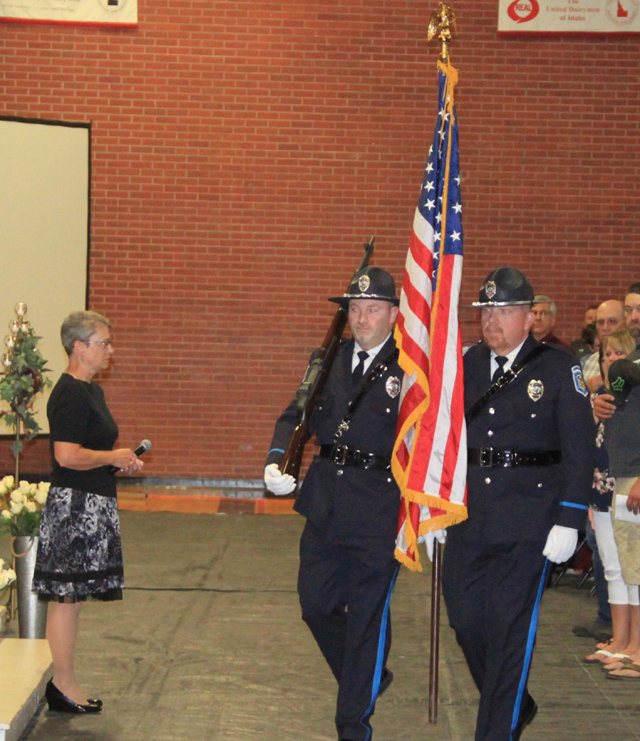 The color guard brings in the flags while Sally Rehder gets ready to sing the ‘Star Spangled Banner” to open graduation.