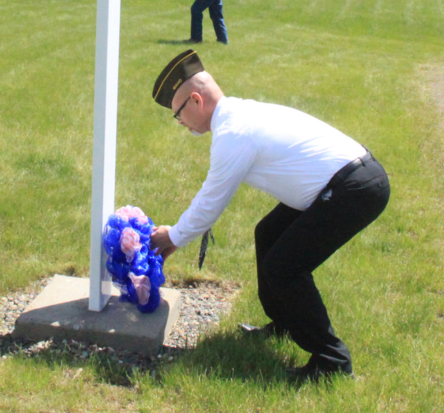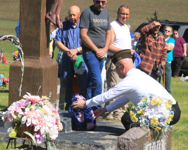 Dale McElroy lays the wreath at the Keuterville Cemetery.