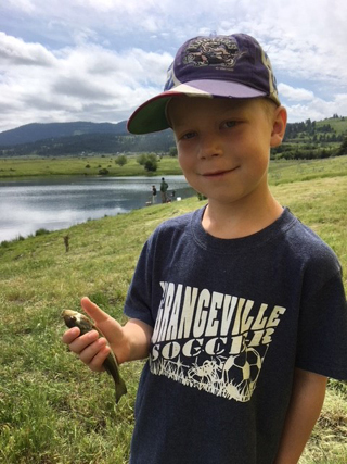 Saturday, June 9 was the 30th Annual Free Fishing Day event at Wilkins’ Pond, located on Lake Road south of Grangeville. This year, 72 participants–including 42 kids–enjoyed a great morning of fishing on the Camas Prairie, just before the rains and wind rolled in. The event was sponsored by the Salmon River Ranger District of the Nez Perce-Clearwater National Forests, Idaho Department of Fish and Game, Cottonwood Field Office of the Bureau of Land Management, and the Grangeville Lions Club. The Grangeville Lions Club donated funds to purchase prizes from Rae Brothers Sporting Goods and Crema Café, as well as free hot dogs and drinks for all event participants! Big prizes were awarded to kids for the biggest fish, smallest fish, and the winners of the casting contests. Prizes were also awarded via random drawings, and lucky winners claimed fishing poles, fishing tackle, books, and gift certificates. The first fish of the day was a bass caught by McKenzie Holman. In the 8 and under age group, the smallest fish (5.5 inches) was caught by Owen Wolffing. The biggest fish of the day (13.75 inches) was caught by Gracen Branson, and Timo Maki was close behind, catching the second–largest fish (13.5 inches). Aaron Maniford won the casting contest. In the 9 to 12 age group, the smallest fish (10.5 inches) was caught by Ben Faries, and the biggest fish (14 inches) was caught by Rayden Nuxoll. Biggs Rambo caught the second–largest fish at 13.5 inches. Austin Rogers won the casting contest for this age group. Special thanks goes to Jeff and Carla Wilkins for allowing us to use their pond again this year. A big thanks go to the Grangeville Lions Club, Rae Brothers Sporting Goods, Asker’s Harvest Foods, Grangeville Centennial Library, and Crema Café for the funding and prizes for the event. Finally, a big thank you to the many folks that helped out to make the day a success–Ethan Bishop and Brett Forge, Idaho Department of Fish and Game; Craig Johnson, Bureau of Land Management; Heidi Holubetz, Jackie Uhling, Ben Uptmor, Dannae Stewart, Grant Gehring, Jonathan Duperroy, Kate Dedrick, Kevin Barger, Archie Tirado, Frances Derezes, Jennie Fischer, USDA Forest Service; and everyone’s favorite fire prevention icon, Smokey Bear! Thank you to everyone who came out to Free Fishing Day–see you next year!