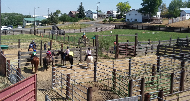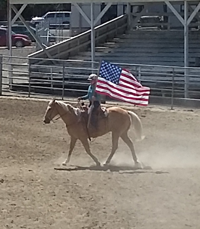 Trail class competitors wait their turn at the Idaho County 4-H Horse Show. Photo by Susie Heckman. Naomi Connolley rides in with the flag to start the Idaho County 4-H Horse Show. Photo by Susie Heckman.