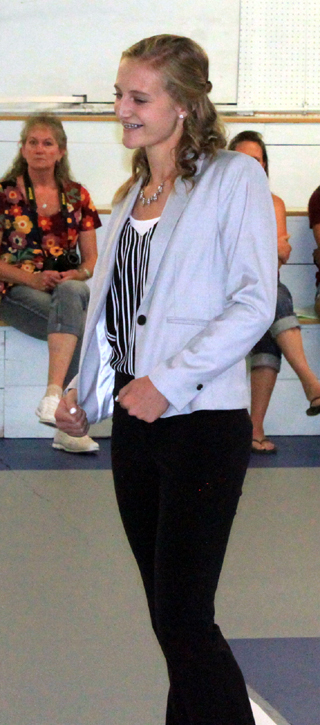A Cloverbud model stands in front of the judges after modeling her sewing project, which is an apron.