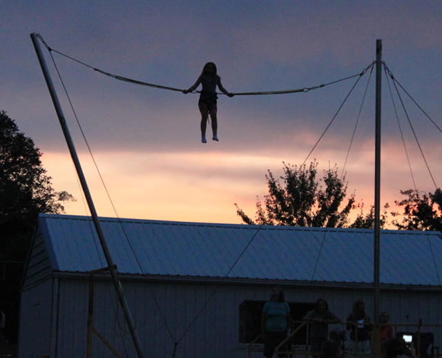 A young lady on the bungee jump ride is silhouetted