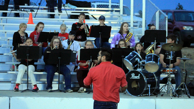 Song after touchdowns. Back to the camera is new band director Jon Madrid.