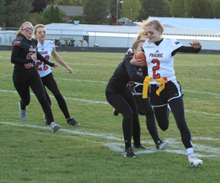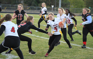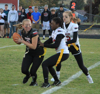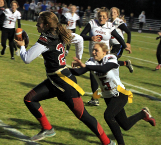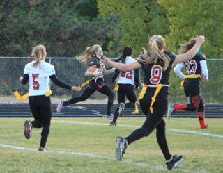 for a touchdown for the Sr./Frosh team. Hope McIntire, #9 is in the process