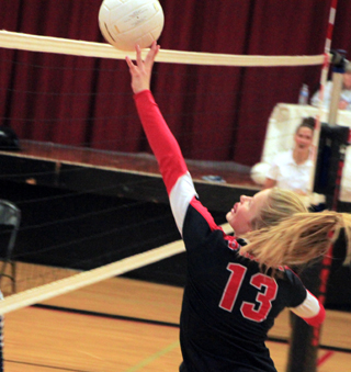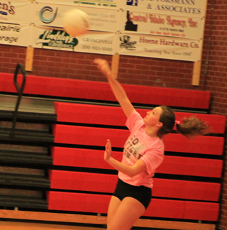 Alexis Hiler has just spiked the ball on Senior Night against Grangeville. 25-JV at Genesee JV Tourn. 28-Potlatch*, here, won 3 games to 0 6-C.V.*, there, won 3 games to 0