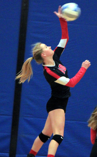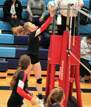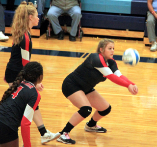 Hope Schwartz digs a serve at Lapwai as Theresa Wemhoff and MMadison Shears watch. 25-JV at Genesee JV Tourn. 28-Potlatch*, here, won 3 games to 0 6-C.V.*, there, won 3 games to 0