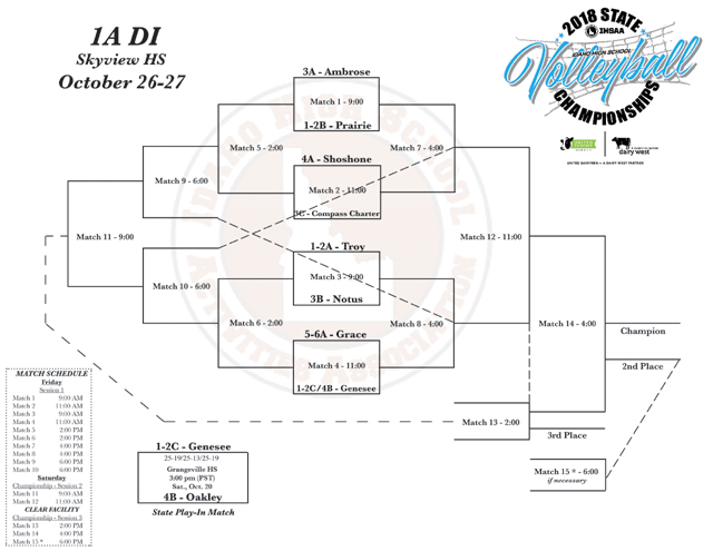 Prairie was unable to score a single point while they were serving in the game. The second game started even worse as Troy took leads of 0-7 and 1-12. Prairie finally scored their first service point when Alexis Hiler served an ace to make it 4-14, but Troy then scored the sideout. Prairie got a second point while serving when Theresa Wemhoff scored an ace to make it 7-19. Otherwise the game was all Troy. In the third game Prairie was able to put up a fight. They took their first lead of the match when Hiler served an ace to make it 3-2. They again took leads of 4-3 on a sideout kill by Wemhoff and at 5-4 on a sideout kill by Kristyna Krogh. Ellea Poxleitner followed with a kill to make it 6-4. Troy then asserted themselves again and took a 6-9 lead. A missed served and a push by Hope Schwartz closed the gap to 8-9 but Troy then pushed the lead to as many as 7 at 11-18. Prairie was able to close back within 3 at 17-20 after a block by Hiler and an ace by Madison Shears. They then got to within 2 at 19-21 on a sideout kill by Krogh followed by an ace from her. After a missed serve, Troy took a 19-24 lead. Schwartz scored a kill to stave off one match point and a tip by Wemhoff saved another before Troy’s junior star, Lindsey Kwate, the White Pine League Division 1 player of the year, put the match away with a kill. For the match Wemhoff had 8 kills and 1 ace. Krogh had 8 kills, including a block, 12 assists and 1 ace. Schwartz had 5 kills and 9 assists. Hiler had 4 kills, including 2 blocks, 1 assist and 2 aces. Poxleitner had 3 kills. Jordyn Higgins had 2 kills and 1 assist. Shears had 2 kills and 1 ace. Ashton Landers was unable to play due to another commitment. With the loss Prairie will be the District’s #2 seed at state and will open state play at 9 a.m. MDT Friday, Oct. 26 against District 3 champion Ambrose. Troy plays the District 3 runner-up Notus at the same time. Genesee, after taking the long way to state, will play at 11 a.m. MDT against District 5-6 champion Grace. Prairie takes a 15-8 record into the state tournament.