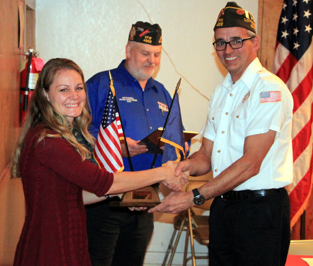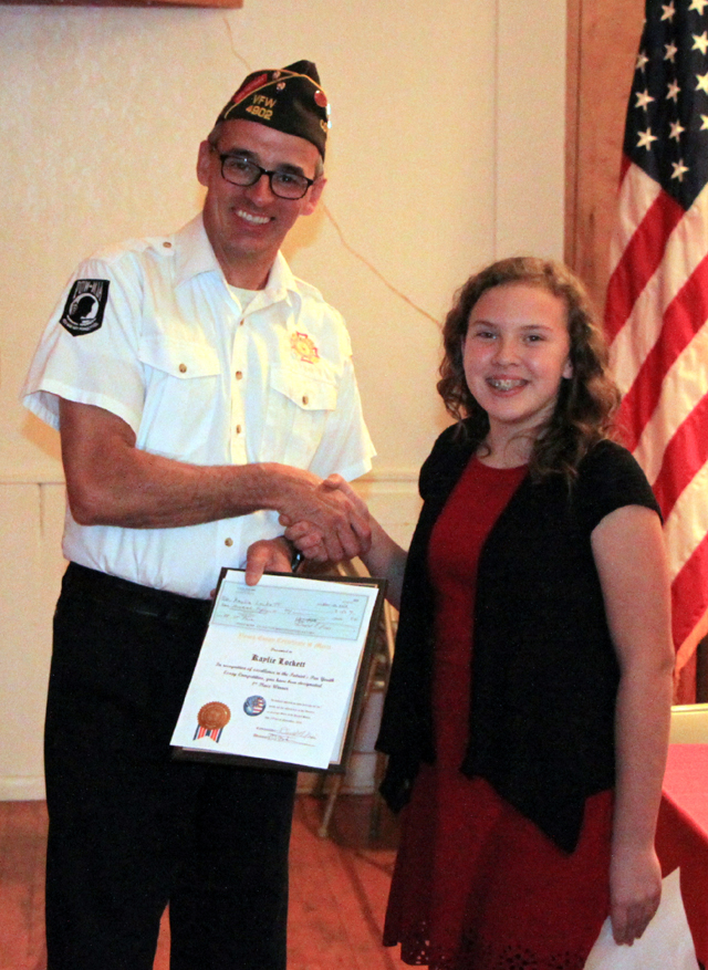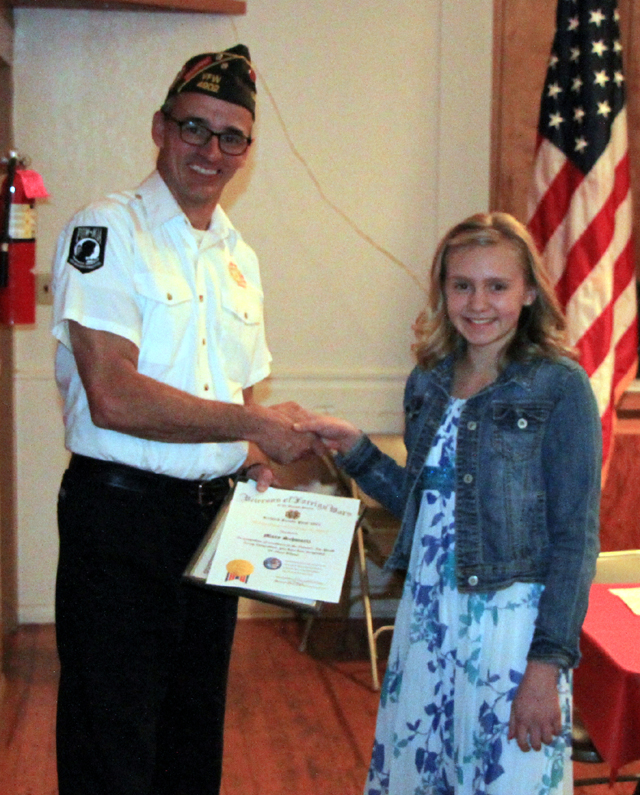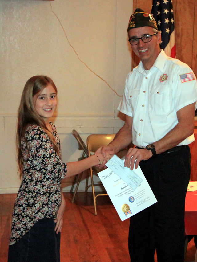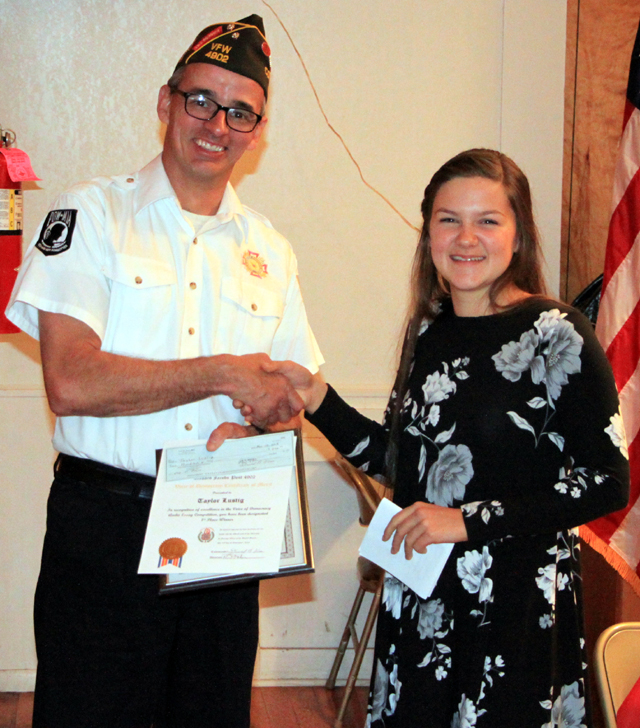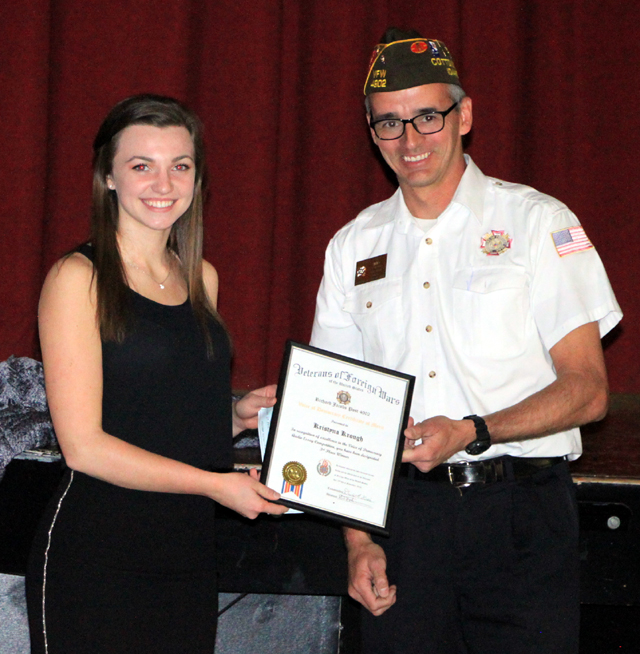receives her first place award in the VFW’s Patriot’s Pen award from Dave