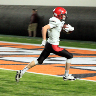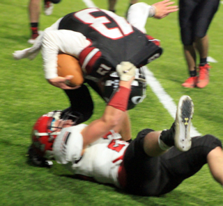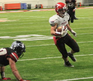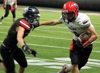 Prairie received the opening kickoff and moved the ball into Oakley territory before having to punt. The defense forced Oakley to punt but then Prairie had to punt it back with Oakley taking over on their own 40. The Hornets got a 26 yard pass play from Chandler Jones to Jake Pulsipher to move deep into Prairie territory. The Pirates defense stiffened though and stopped Oakley on fourth down as Owen Anderson tackled Jones for a 4 yard loss on fourth and 6 at the 12. A false start penalty set Prairie back to the 11 and on third and 15 Spencer Schumacher threw a low line drive of a pass out to the right that Oakley’s Austin Bedke intercepted at the 10 and took in to the end zone for the game’s first points. Jones passed to Pulsipher to make it 0-8. Prairie fumbled the ball right back to Oakley on the fifth play of their ensuing possession with the Hornets tacking over at their own 47. Oakley moved the ball downfield and scored again to make it 0-14 as Prairie stopped the 2-point try. Michael Schwartz returned the kickoff 27 yards to the Prairie 39. A loss of 3 yards was followed by a false start penalty. Facing second and 18 Schumacher connected deep down the field to Damian Forsmann for a 50 yard gain to the Oakley 19. Schwartz netted 4 yards on a pair of runs and then Schumacher found Forsmann open over the middle for a 15 yard scoring play. Schumacher then passed to Schwartz for the 2-pointer to cut the deficit to 8-14. Prairie got hit with a personal foul penalty after the 2-point play as a Prairie player got caught retaliating to something an Oakley player did to him. That forced Prairie to kick off from the 25 instead of the 40. Oakley’s Josh Nyman took the kickoff at the Oakley 45 yard line and was able to return it all the way for a touchdown, breaking several tackles along the way. That put Oakley back on top by 12 at 8-20. Derik Shears returned the ensuing kickoff 20 yards to the Prairie 28. After a short pass to Anderson, Schumacher again connected with Forsmann for a 54 yards gain to the Oakley 15. A false start penalty and a 4 yard loss set Prairie back to the 24. On the next play, Schumacher connected with Shears down the left side for a 24 yard touchdown the pulled the Pirates within 6 at 14-20. On their next possession Oakley came up short on a fourth and 16 play at the Prairie 43 with the Pirates taking over on downs. Prairie picked up a first down to move into Oakley territory. On third and 10 from the 47 Schumacher completed a screen pass to Anderson for a 17 yard gain and a first down at the 30. On third and 13 from the 33, Schumacher threaded a pass deep over the middle to a double-covered Forsmann for a touchdown that tied the score. Caleb McWilliams bulled his way into the end zone for the go-ahead 2-point conversion with 51 seconds left in the half. Prairie had a chance to extend the lead when Shears intercepted an Oakley pass at the Prairie 35 and returned it to the 42. Schumacher picked up 16 yards on a scramble but was then sacked for a 4 yard loss. On the final play of the half his pass fell incomplete. Oakley