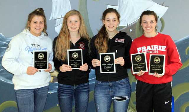 Prairie volleyball awards were given out last Wednesday, Nov. 7. From left are Hope Schwartz, most inspirational; Theresa Wemhoff, co-captain; Alexis Hiler, most improved and Kristyna Krogh, co-captain and most valuable. 17 turn out for girls basketball In one of their smallest turnouts in years, the Prairie girls basketball team had 17 girls turned out this season. Coach Lori Mader will have 9 players each on the varsity and JV with one of those players being a swing player. Senior Jordyn Higgins and junior India Peery are the only returning starters from last year’s state runners-up. Also on the varsity are seniors Alexis Hiler, Theresa Wemhoff and Kristyna Krogh; juniors Ciara Chaffee and Sydnee Bruegeman and sophomores Madison Shears and Ellea Uhlenkott. JV players will be Bruegeman, sophomore Hope Schwartz and freshmen Ali Rehder, Olivia Klapprich, Delanie Lockett, Trinity Martinez, Laney Forsmann, Molly Johnson and Josie Remacle. Steve Wilson returns as assistant coach with David Shears returning as JV coach. Coach Lori Mader says Lapwai will be the team to beat and she sees Genesee as a possible contender. The Lady Pirates season gets started this Thursday, Nov. 15 with a league game at Clearwater Valley. Their first home game will be Friday, Nov. 30 against Potlatch. Coach Lori Mader will have 9 players each on the varsity and JV with
