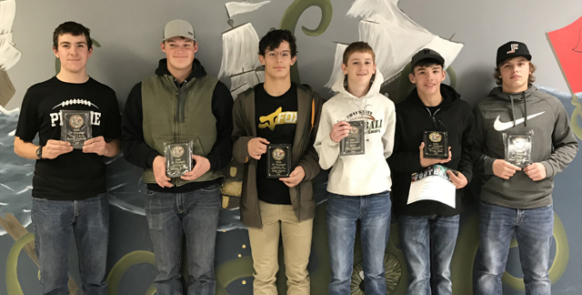 JV football award winners from left are Carson Forsman, Pirate Award; Garrett Bunce, offensive line player of the year; Jesse Cronin, defensive line player of the year; Cole Schlader, MVP; Dalton Ross, Defensive player of the year and Brody Hasselstrom, offensive player of the year. Photo by Kim Schumacher. Pirates dominate all-league team The league champion Prairie football dominated the selections on the all-White Pine League Division 1 football team. Prairie had 5 first-team all-league offensive players and 6 first team all-league defensive players while Spencer Schumacher was named player of the year and the coaching staff was named as coach of the year. Named to the first team offense were Spencer Schumacher at quarterback, Cole Martin and Caleb McWilliams at running back, Derik Shears at wide receiver and Carson Schmidt at offensive guard. Damian Forsmann was a n honorable mention at wide receiver as was Hayden Uhlenkott at center. Named to the first team defense were Michael Schwartz and Dylan Schumacher at defensive back, McWilliams and Owen Anderson at linebacker, Spencer Schumacher at defensive end and Schmidt at defensive tackle. Dean Johnson was named to the second team at defensive tackle. PIRATES BOYS BASKETBALL SCHEDULE FOR 2018-19 JV games start at 6 p.m., varsity to follow unless indicated *indicates league game DECEMBER 4-Kamiah, here* 5-JV vs. Grangeville, here, 7:30 7-Grangeville, there, Idaho County Shootout, V only, 7:30 p.m. 8-Troy Quad, here*, 4 & 5:30 13-Lapwai, there* 15-Genesee, here* 20-22-New Plymouth Tourn. 4-Moscow, here, (C,JV,V) 4 p.m. 8-C.V., there* 11-Potlatch, there* 15-Kamiah, there* 19-Troy Quad, there*, 1 & 2:30 22-Lapwai, here* 26-Ambrose @ Riggins, 3 & 4:30 MST 2-Genesee, there* 5-C.V., here* 7-Moscow, there, (C,JV,V) 4 p.m. 11-20-District at LCSC 21-State Play-In at Post Falls 23-State Play-In at McCall Feb. 28-March 2-State at Caldwell PRAIRIE JUNIOR HIGH BOYS BASKETBALL NOVEMBER 27-Orofino, there 29-Grangeville, here 6-Grangeville, there 11-Kamiah, here 18-Kamiah, here |