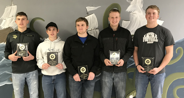 Varsity football award winners are shown. From left are Derik Shears, offensive player of the year; Owen Anderson, defensive player of the year; Dean Johnson, defensive line player of the year, Carson Schmidt, Offensive line player of the year and Spencer Schumacher, MVP. Not shown is Sam Mager, Pirate award. Photo by Kim Schumacher.