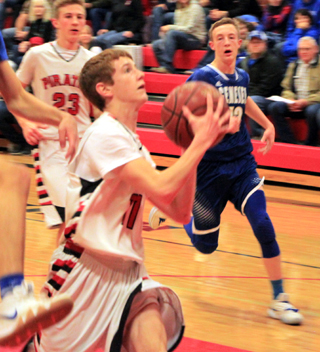 Genesee scored the first 7 points of the game, all by their 6’4” post Jeffrey Waisenen. Prairie finally got on the scoreboard when Spencer Schumacher scored a putback at the 4:45 mark. He then followed with a drive to the hoop for a lay-up. Dylan Schumacher scored 2 baskets and Spencer Schumacher scored another putback to complete a 10-0 Prairie scoring run that gave them the lead for good. Genesee scored but Schlader answered with a 3-pointer. After another Genesee score, Dylan Schumacher and Schlader each added a basket to make it 17-11 after 1 quarter. The Pirates scored the first 8 points of the second quarter to push their lead to 14 points. Schlader stole the ball and scored a lay-up. Dylan Schumacher scored inside. Dylan added another basket after a steal by Spencer Schumacher and Forsmann closed out the run by making a steal and scoring. Genesee was able to outscore Prairie 9-12 to make it 34-23 at the half. Spencer Schumacher scored 8 of Prairie’s 10 third quarter points as the rest of the team struggled to find the basket. Genesee managed to slice a point of the lead as they trailed 44-34 after 3 quarters. Forsmann got hot in the fourth quarter hitting 3 of 4 from the field and 3 of 3 at the line. Dylan Schumacher was 2 for 2 from the field and 1 for 1 at the line for 5 fourth quarter points as Prairie outscored Genesee 19-10 to pull away for a 19 point win. Forsmann wound up as the leading scorer with 16 points with both Schumachers also hitting double figures with Dylan scoring 15 and Spencer 14. Schlader scored 9, Shears 5 and Ross and Owen Anderson 2 each. Prairie had a 36-33 edge on the boards as Spencer Schumacher had 12 rebounds to lead the Pirates. Ross added 7 rebounds. Forsmann had 4 steals while Shears had 3 with Ross and Schlader each having 3 assists. Prairie was 26 for 59 from the field, 44%, and 9 for 12 at the line, 75%. Genesee was 15 for 45 from the field, 33%, and 12 for 26 at the line, 46%. Prairie is now 4-3 overall and 4-1 in league play. The JV team won 48-24 to improve to 7-0 on the season. Prairie jumped out to a 13-0 lead in the first quarter with Cole Schlader scoring 9 of their first 11 points. Sam Mager and Zack Rambo each added a basket. Genesee broke through with 3 minutes to play in the opening quarter and added another basket to make it 13-4. Prairie then closed out the quarter with a 6-0 run with Mager, Schlader and Dean Johnson each scoring a basket. Johnson’s came on a putback at the buzzer. Prairie then scored the first 4 points of the second quarter as Brody Hasselstrom and Rambo each scored a basket for a 23-4 lead. After a Genesee basket, Prairie scored another 8 straight points to make it 31-6. Hasselstrom scored a 3-pointer with Mager and Tyler Wemhoff each adding a basket and Hayden Uhlenkott a free throw. Prairie led 33-10 at the half. Prairie started the third quarter with another 8-0 run with 4 different players scoring. Prairie wound up outscoring Genesee 12-2 in the quarter to take a 45-12 lead into the fourth. The fourth was played with a running clock and Wes Munger had Prairie’s only points of the quarter on a 3-pointer as Genesee outscored Prairie 3-12 to cut the final margin to 24. Schlader led the scoring with 11 points despite playing just the first quarter. Hasselstrom, Mager and Rambo each scored 6. Uhlenkott, Johnson and Kyle Schwartz each scored 4. Munger scored 3 and Travis Alfrey and Wemhoff each scored 2. Genesee had a 25-27 edge on the boards with Hasselstrom leading Prairie with 6 rebounds. Mager and Schwartz each had 4 steals and Uhlenkott, Johnson, Schwartz and Rambo had 3 each as Prairie forced 33 turnovers from the Bulldogs. 7 different players had an assist with Mager the only one to have more than 1 with 2. The JV’s were 20 for 55 from the field, 36%, and 5 for 11 at the line, 45%. Genesee was 12 for 26 from the field, 46%, and 0 for 1 at the line. Prairie 17 17 10 19 -63 Genesee 11 12 11 10 -44 Prairie-Anderson 1-3, 0-0, 2; Forsmann 6-12, 3-3, 16; Ross 1-8, 0-0, 2; S. Schumacher 6-11, 2-4, 14; Shears 2-6, 1-2, 5; D. Schumacher 7-10, 1-1, 15; Schlader 3-7, 2-2, 9; Mager 0-0, 0-0, 0; Hibbard 0-2, 0-0, 0. 3-pointers-Forsmann, Schlader. Genesee-Lindquist 5-12, 1-1, 11; Spence 2-6, 0-0, 5; Durham 1-6, 1-2, 3; Frasure 0-2, 0-0, 0; Waisanen 5-13, 7-14, 18; Wareham 2-5, 1-3, 5; Sperber 0-1, 2-6, 2; Ketcheson 0-0, 0-0, 0; Crowley 0-0, 0-0, 0; Schreiber 0-0, 0-0, 0. 3-pointers-Spence, Waisanen.