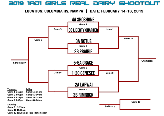 The Prairie Lady Pirates will open against District 3 champion Notus at 3 p.m. MST (2 p.m. our time) at the State tournament Thursday, Feb. 14. The tournament will be held at Columbia High School in Nampa, the same site as the past several years. Notus comes in with a 17-5 overall record. They tied with Rimrock for the Western Idaho Conference championship then beat Rimrock in the District championship game 53-48. Rimrock will play Lapwai at 8 p.m. MST on Thursday. Genesee also qualified for state by winning a pair of play-in games over Wallace and District 4 runner-up Raft River. They will play Districts 5-6 champion Grace at 6:15 p.m. MST. The other game in Prairie’s half of the bracket is District 4 champion Shoshone against District 3 third place team Liberty Charter. That game will be before Prairie’s game. If Prairie wins their opener, they will play again at 6:15 p.m. Friday. If they should lose, they would play at 1:15 p.m. Friday. See bracket below.