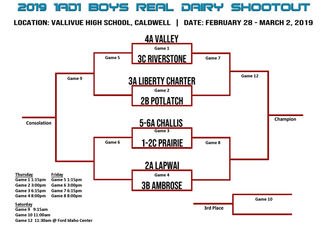 Prairie opens State Tournament play against District 5-6 champion Challis, 16-6, at 5:15 PST on Thursday, Feb. 28 at Vallivue High School in Caldwell. Challis was second in their league, losing twice to Grace but won 2 of 3 against Grace at District to earn the state berth. The only common opponent was Oakley, who Challis lost to by 17 then beat by 12. Valley, 18-4, plays Riverstone, 15-10. Liberty Charter, 18-6 with a loss to Prairie, plays Potlatch, 17-6. Lapwai, 18-4, plays Ambrose, 16-7 with a loss to Prairie.