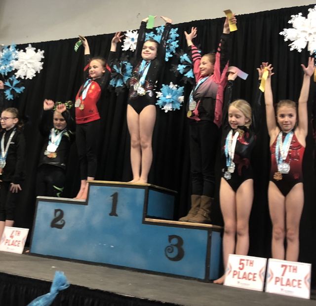 Marji Remacle, above the 2, after being awarded second place overall at a gymnastics meet at Hayden.