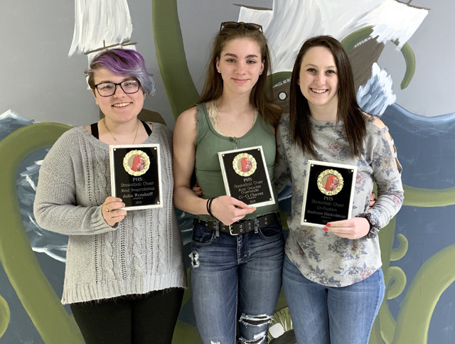 Prairie Cheerleader awards were given out Monday, March 11. Pictured from left are: Julia Wemhoff (most inspirational), Ci-Ci Chavez (most valuable cheerleader), and Madison Hinkelman (co-captain). Not pictured are Sapphire Yorke (most improved) and Noelle Uhlenkott (co-captain). Photo submitted by Emily Cash.