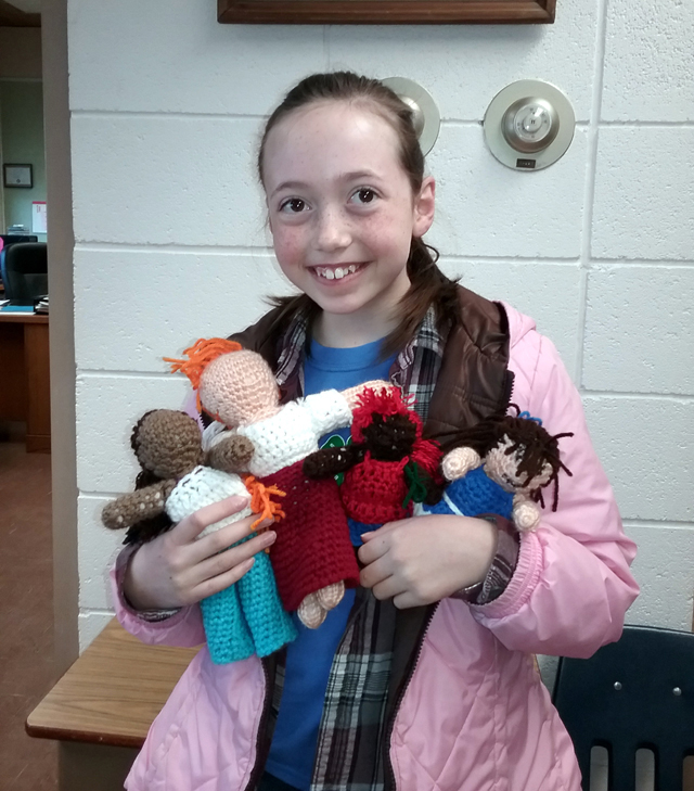 Prairie Elementary School, with several of the dolls she crocheted for