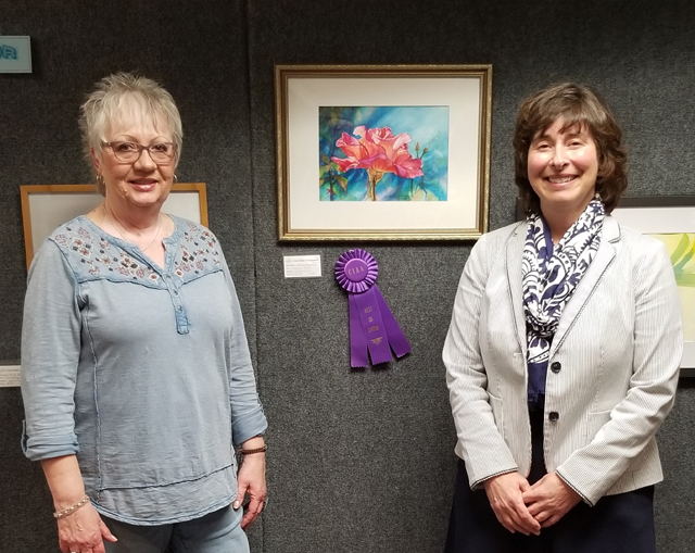 CIAA BEST OF SHOW awarded by judge Melanie Fales (L) to Jackie Zumalt (R) for her watercolor picture ""Classic Rose."