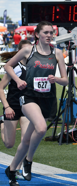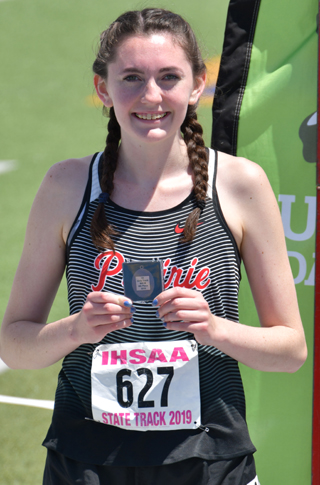 The Prairie girls 4x200 relay team won at State for the third year in a row. They were Prairies lone state champions although there were several other medal winners. Ellea Uhlenkott, Sierra McWilliams, Jordyn Higgins and Theresa Wemhoff posted a time of 1:50.12 to win the event. All 4 of the girls relays earned medals and as coach Ryan Hasselstrom put it, they hit for the cycle. The 4x400 team of Uhlenkott, Higgins, McWilliams and Wemhoff placed second in 4:17.17. The 4x100 team of Uhlenkott, Higgins, McWilliams and Wemhoff finished third in 52.61. The medley team of CiCi Chavez, McWilliams, Wemhoff and Higgins finished fourth in 1:59.56. Ciara Chaffee earned a medal in 800 where she finished 6th in 2:27.85. She was 10th in the 3200 in 12:20.59 and 10th in the 1600 in 5:32.73. Uhlenkott earned a medal in the 300 hurdles with a 6th place finish in 50.55. For the boys team Carson Schmidt was the lone state medalist. He placed third in the shot put with a personal best by over 3 feet at 4611. He was 7th in the discus at 12111. Matt Coppernoll was 9th in the discus at 1174. Cole Martin was 16th in the 100 in 11.91, 14th in the 200 in 24.46 and 13th in the long jump at 18½. As a team the girls placed 5th, 1 spot shy of earning a trophy, with 35 points. The boys placed 20th with 8 pts. All photos below by Cara Uhlenkott except where indicated.