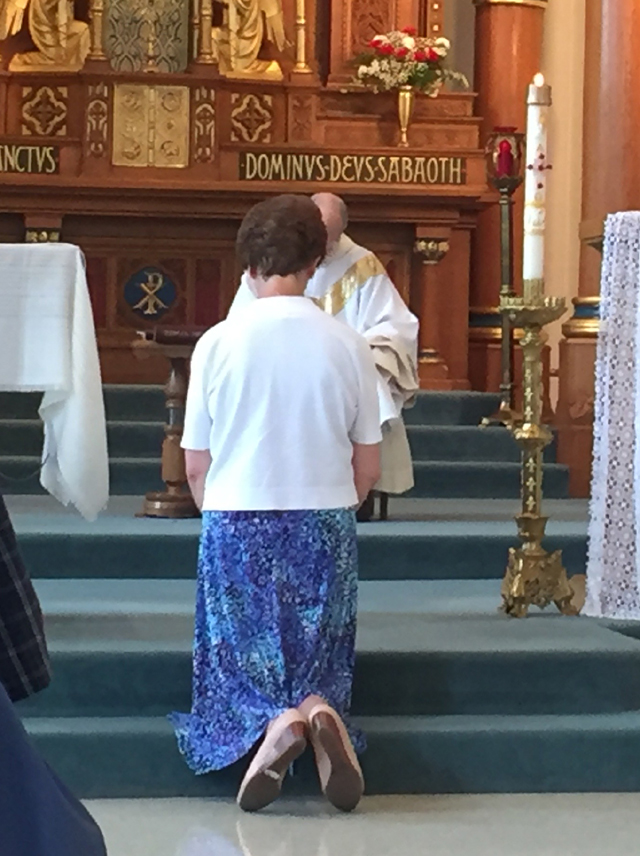 Sister Betty kneels while the monastic community sings the Suscipe: "Receive me, oh Lord, that I may live..." |
