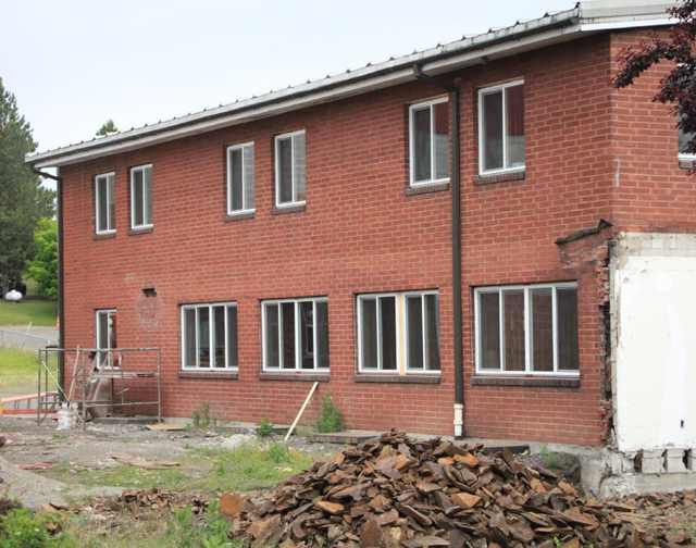 side of the building. Some of the new windows have been installed on the