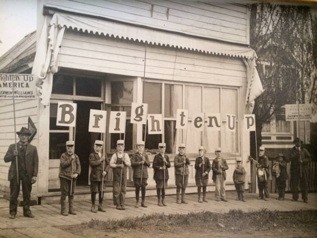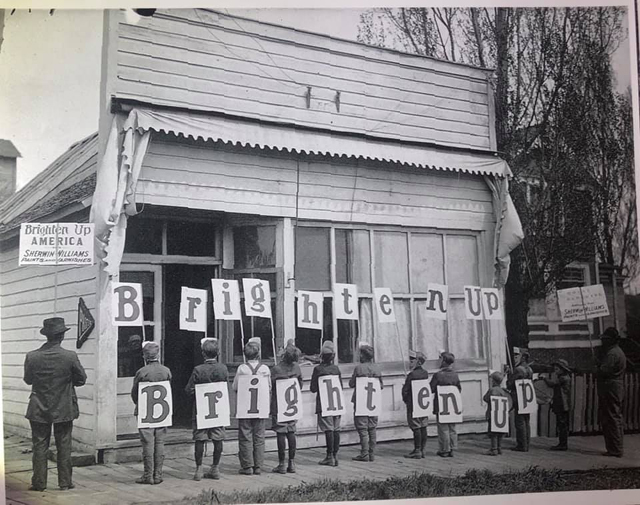 This is taken on June 2, 1917. Gus Hoene, is the 9 year old boy holding the R. Bill Kelsey, brother of store manager, Frank Kelsey visiting for a few years, is on the left. Jake Welte is on the right. It may be that a 6 year old Hank Seubert is holding the U. Possibly a mix of Jennys and Seuberts and maybe a Kopcynski in here. Brighten up America! was the campaign - that's a good thing to remember every day. This picture is not in front of the store. By this time, they had the new brick building built. This may have been taken on the north side of main street across from Cottonwood Foods, possibly near where Gem Builders is now. The photo below shows the same group after they turned around.
