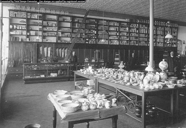 John Hoene, Frank Kelsey and Barney Seubert 1918 in the front of the store. The ladder was used to stock and get items from the top shelves.. You can still see the holes in the ceiling from where the bolts used to be for the track.