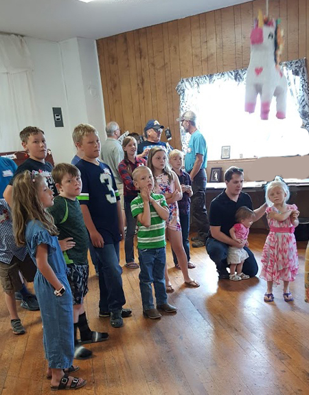 Sunday morning dawned beautifully, full of sunshine. Cars started coming to Keuterville Hall, kids got out, food was brought in and before we knew it, the hall was full, the lawn around the hall was full and we had gathered together, about 250 of Vince and Anna Duman’s descendants, for the second Idaho Duman Reunion on Sunday, July 7. How it all started: Vince and Anna Duman loaded a train car with their household belongings and another railcar with their cattle in Akron, Colorado, and headed to Camas Prairie, namely Cottonwood, their destination. This was in 1918 when they left with their daughter Mary. In November of that year their second child was born, Alfred, followed by Regina, Dominic, Agnes, Harold, Greg, Frances, Elizabeth, Catherine, John, Vinny (Vinny, Jr.) and Patricia. They lived where the present Rehder Farm is, earning a living by farming and logging. On December 27, 1945, Vince and Anna and the younger children moved to Portland, Oregon, then the following year moved to Mt. Angel where they resided until their deaths. The Idaho descendants welcomed the Oregon and Washington and Montana descendants. Many had to get reacquainted with each other. An interesting note: Each of Vince and Anna’s children who had children had a child or more at the reunion. Another interesting note: The youngest child was one month. The oldest person – well, no one would admit to that??? At the Reunion were: Marianne Lambert is Mary LaChapelle’s daughter. Bonnie, Shirley, Jeanne, Donna, Verla, Cleo, Mary, Doris, Connie and Michelle’s are Alfred and Leona Duman’s. Regina had no children. Rita Gallagher and Randy Duman are Dominic and Pat Duman’s. Ron Terhaar is Agnes and John Terhaar’s son. Mick, Dave, Barb, Lynn, Tim and Jan are Harold and Marie Duman’s. Greg had no children. Kathy, Sharon, Gary, Jo Ann and Carol are Fran and Bill Faulhaber’s. Ed Kuther is Bettie and Gene Kuther’s son. Dan Brockamp is Casey and Richie Brockamp’s son. Tom, Denis, Jack and Stacie are John and Marge Duman’s. Jennifer Duman is the granddaughter of Vinny (Vinny Duman, Jr.). Russell Seubert, Jayne Ratzburg and Patrice Larson are Pat and Dick Seubert’s. No Duman gathering is complete until the piano has been played. The unicorn piñata swung from the ceiling until that mighty blow scattered candy, Slinkys, stamps and more all over the floor. Outdoor games were played and everyone enjoyed the afternoon until it was time to say good bye to our Out-of-State relatives. After all evidence was gone of a gathering of families, some went across the lawn to the historic Holy Cross Catholic Church for the Sunday evening 7 pm Mass, also being offered for all the Duman families. It was a perfect way to thank JESUS for all the blessings HE has bestowed on all of us over all these years and especially this day for our heritage.