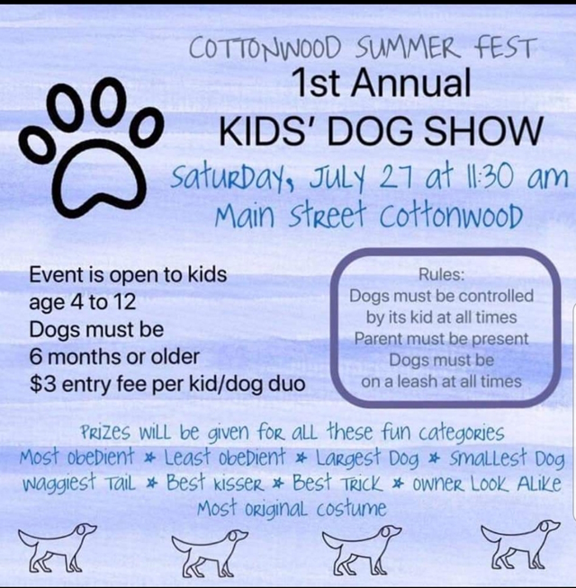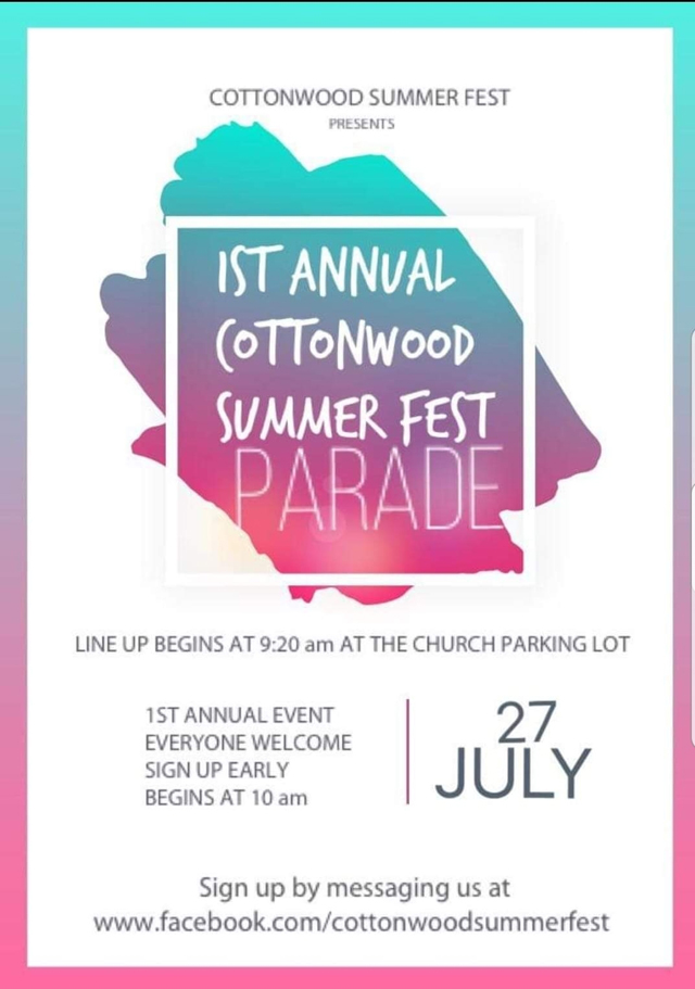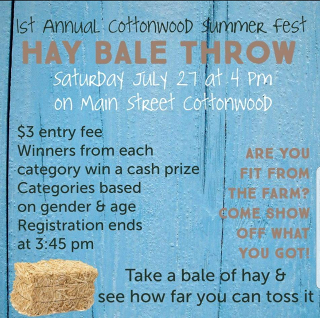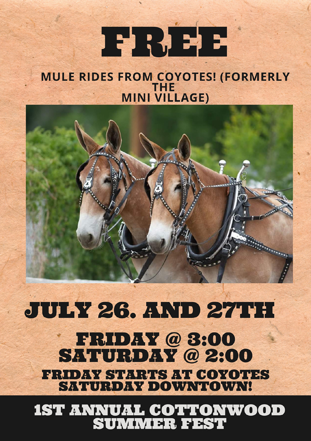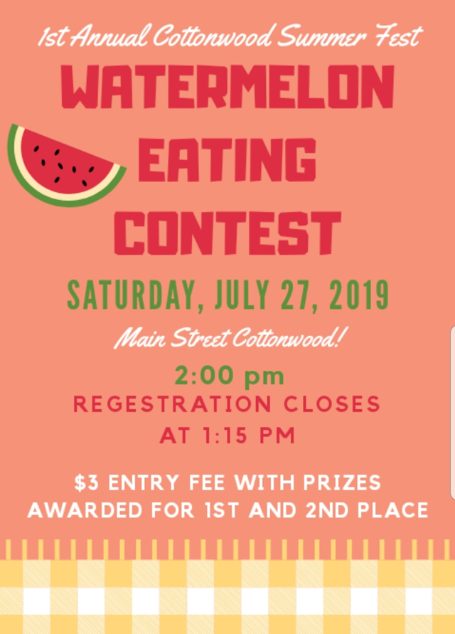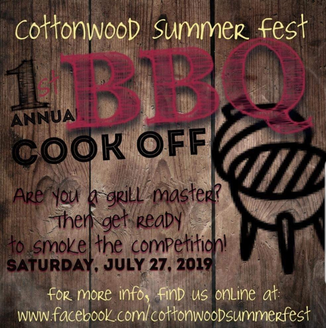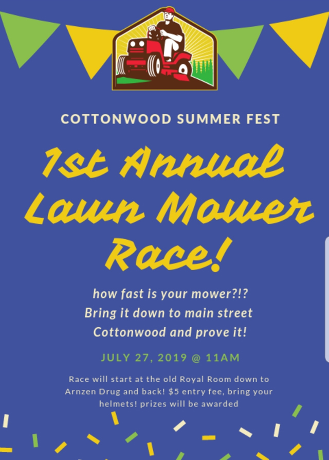 The first ever Cottonwood Summerfest is coming up this weekend. Events start on Friday with a Kids’ Dance at the City Park from 5 to 8 p.m. Saturday, July 27, is the main day of the event with the following events all taking place on Main St. There will be a breakfast at 8 a.m. The Parade is set to start at 10 a.m. There will be Lawnmower Races starting at 11 a.m. A Kids Dog Show is set for 11:30 a.m. The Egg Toss will take place at Noon. There will be a Ping Pong Ball Drop at 1 p.m. A Watermelon Eating Contest is set for 2 p.m. A Hay Bale Throwing Contest is set for 4 p.m. BBQ Contest Judging is set for 6 p.m. A Street Dance with live music by “Five Smooth Stones” is set to start at 7 p.m. Other events downtown all day will be bouncy castles, vendors, and a dunk tank. Also all day Saturday there will be two softball tournaments at the Wimer Ballfields. One is an adult tournament and the other is a high school age co-ed tournament. Another event on both Friday and Saturday is that Coyote’s (formerly the Mini-Village) will be offering free mule rides. On Friday starting at 3 p.m. at Coyote’s and on Saturday starting at 2 p.m. downtown. On Sunday, July 28, there will be an ATV Poker Run that starts at Doreen’s on Main Street at 11:30 a.m. Check out the Summerfest page on Facebook for updates at Facebook.com/CottonwoodSummerFest.