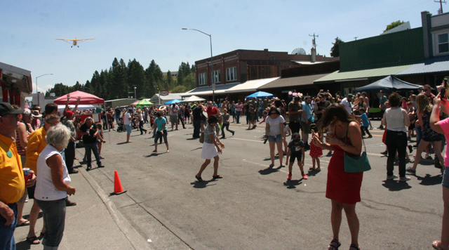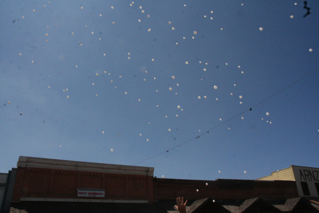 The plane can be seen coming in from the east along Main St. and then the resulting drop of ping pong balls.