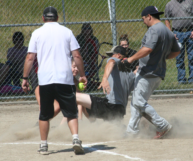A play at the plate during the softball tournament. Jeff Martin, in white, served as an umpire. He is holding a ball because they used different types of balls depending on whether a man or woman was hitting.