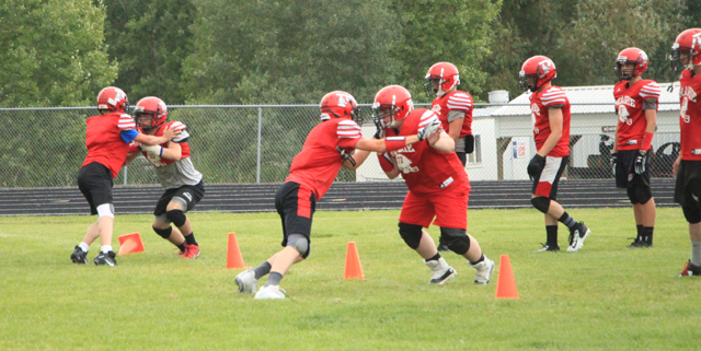 Prairie players take part in a one on one blocking drill at practice last Thursday.