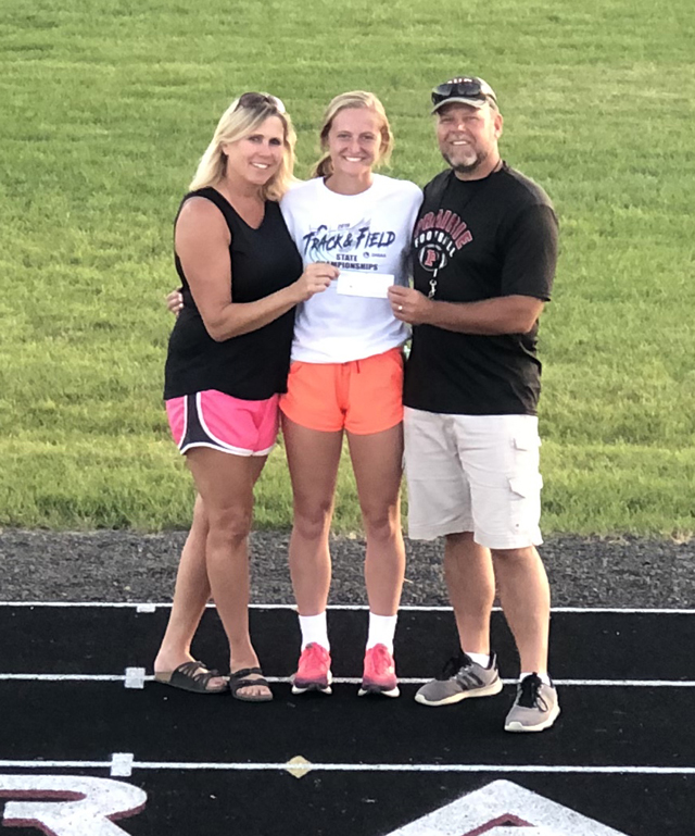 Ellea Uhlenkott, center, is shown with track coaches Becky Higgins and Ryan Hasselstrom after presenting a check for over $3,000 raised from the 100 Mile Challenge. Photo submitted. |
