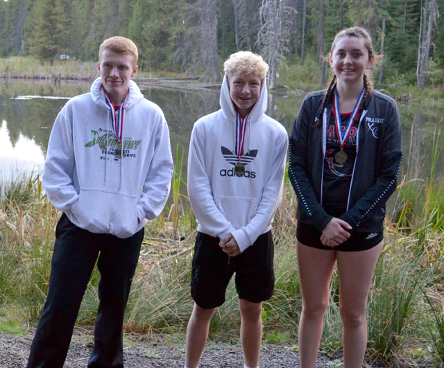 Prairie had 3 medalists at the Moose Creek Invite. From left are Williams Hooper, 10th, and Kyle Schwartz, 7th, in the boys race and Ciara Chaffee, 4th in the girls race. Photo by Shari Chaffee.