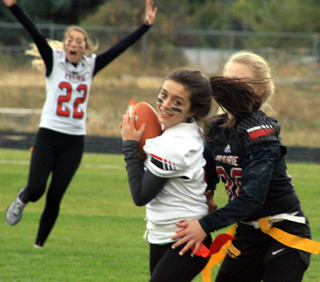 as Ciara Chaffee moves in for a tackle. Also shown in white are Madison