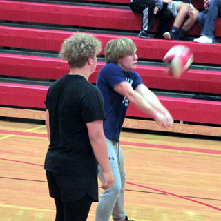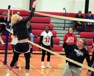 game against the juniors in the “powderpuff” volleyball. Dean Johnson is